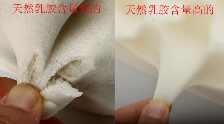 2.看,天然乳胶表层会有结皮现象,看起来就像是奶皮 一样的物质,按压会产生自然的褶皱。合成乳胶在通过高温蒸馏这各环节时,其添加的粉料会发乌发黑,所以一般合成乳胶之中会添加大量的荧光剂和增白剂来掩盖这个现象,所以合成乳胶看起来会很白,而且表面会泛油光。天然乳胶在通过高温蒸馏时,会发黄,在之后会经过一次水洗,水洗之后会呈现出淡黄或者黄白相间的颜色。天然乳胶在制作时会有气泡产生,现在在工艺上是避免不了的,所以太过完美的产品需要小心。